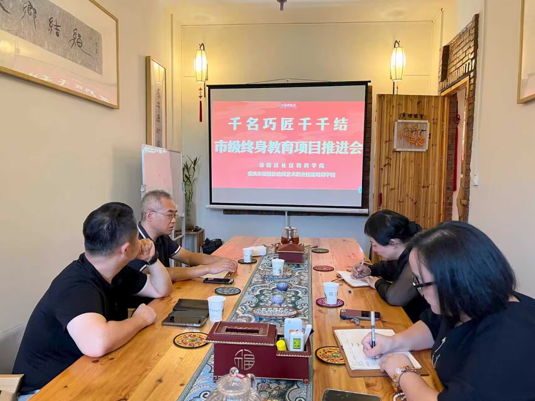 9月26日上午涪陵社区教育学院到涪州结绳技能培训学校探讨“千人巧匠千千结”这个重庆市级特色品牌项目的推进工作,在会上,我们提出了工作进展要求及注意事项,分析了项目重要性,对方也作出了积极回应,提高了认识!另外,还探讨了社区教育的延展工作,如家庭夜校专题讲座的开展等!